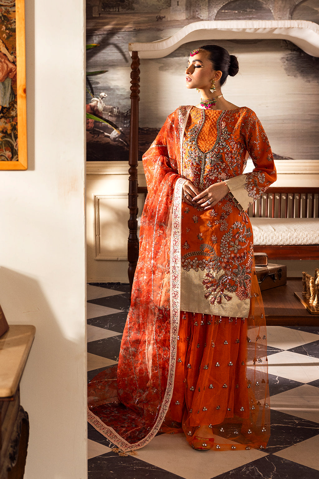 This elegant ensemble features organza shirt with tessellated patterns, paired with a Dupatta featuring Printed Organza and Embroidered Borders. The raw silk trouser, adorned with intricate embroidery and a voluminous flare, adds a touch of uniqueness to this exquisite ensemble.