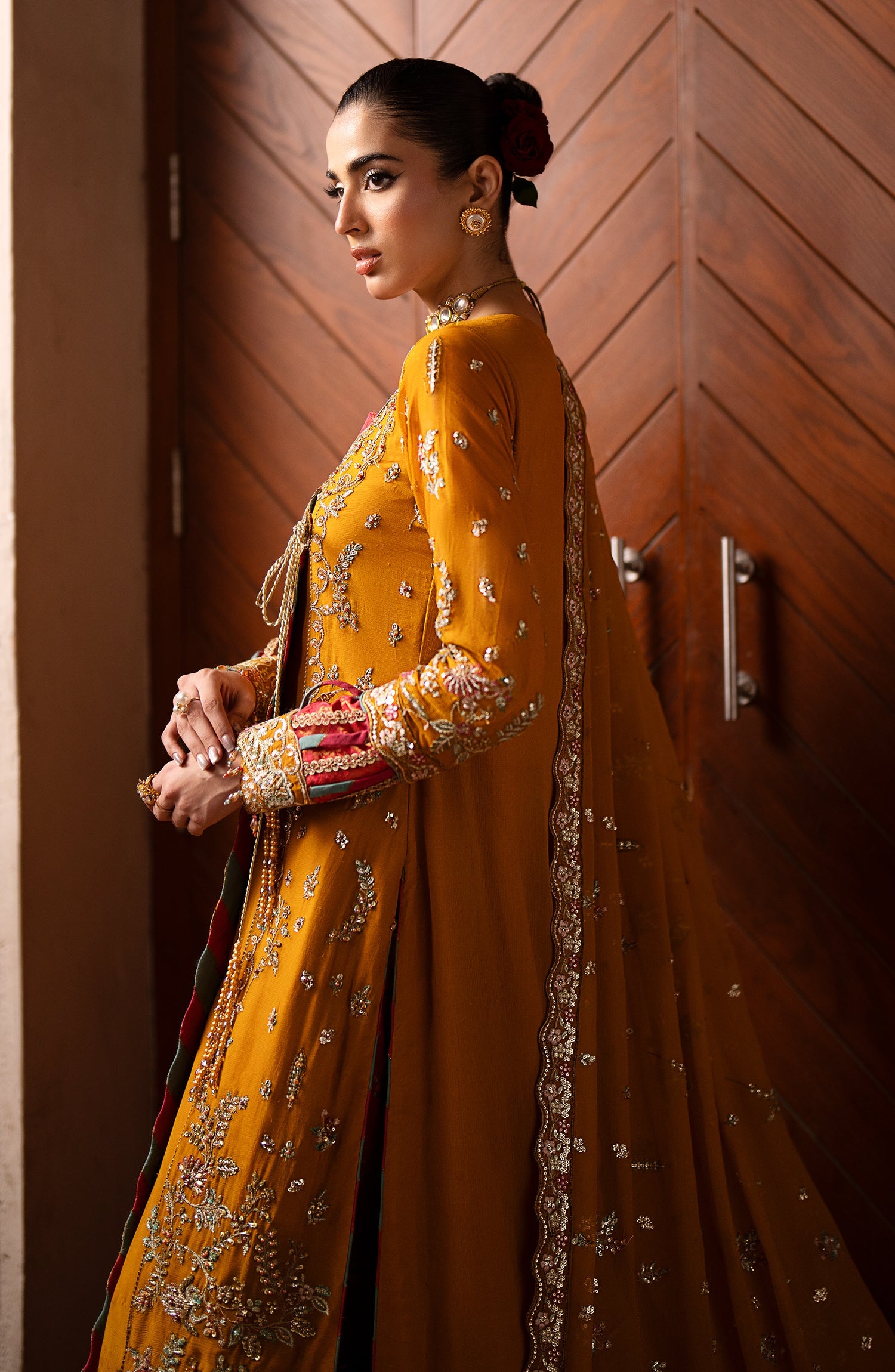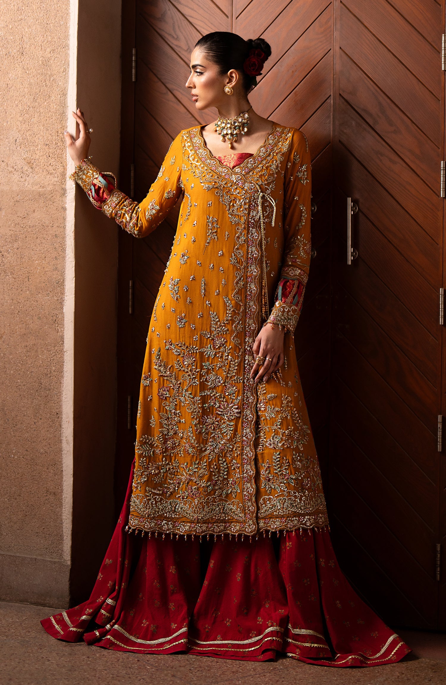Chiffon Embroidered Hand Made Front Right Panel. Chiffon Embroidered Hand Made Front Left Panel. Chiffon Embroidered Hand Made Front Right Panel Lower Patch. Chiffon Embroidered Hand Made Front Left Panel Lower Patch. Chiffon Embroidered Sleeves. Chiffon Fabric For Back. Chiffon Embroidered Dupatta. Organza Embroidered Back Border. Organza Embroidered Sleeves Border. Organza Embroidered Dupatta Paloo Borders. Organza Embroidered Dupatta Borders. Raw Silk trouser With Block Print.