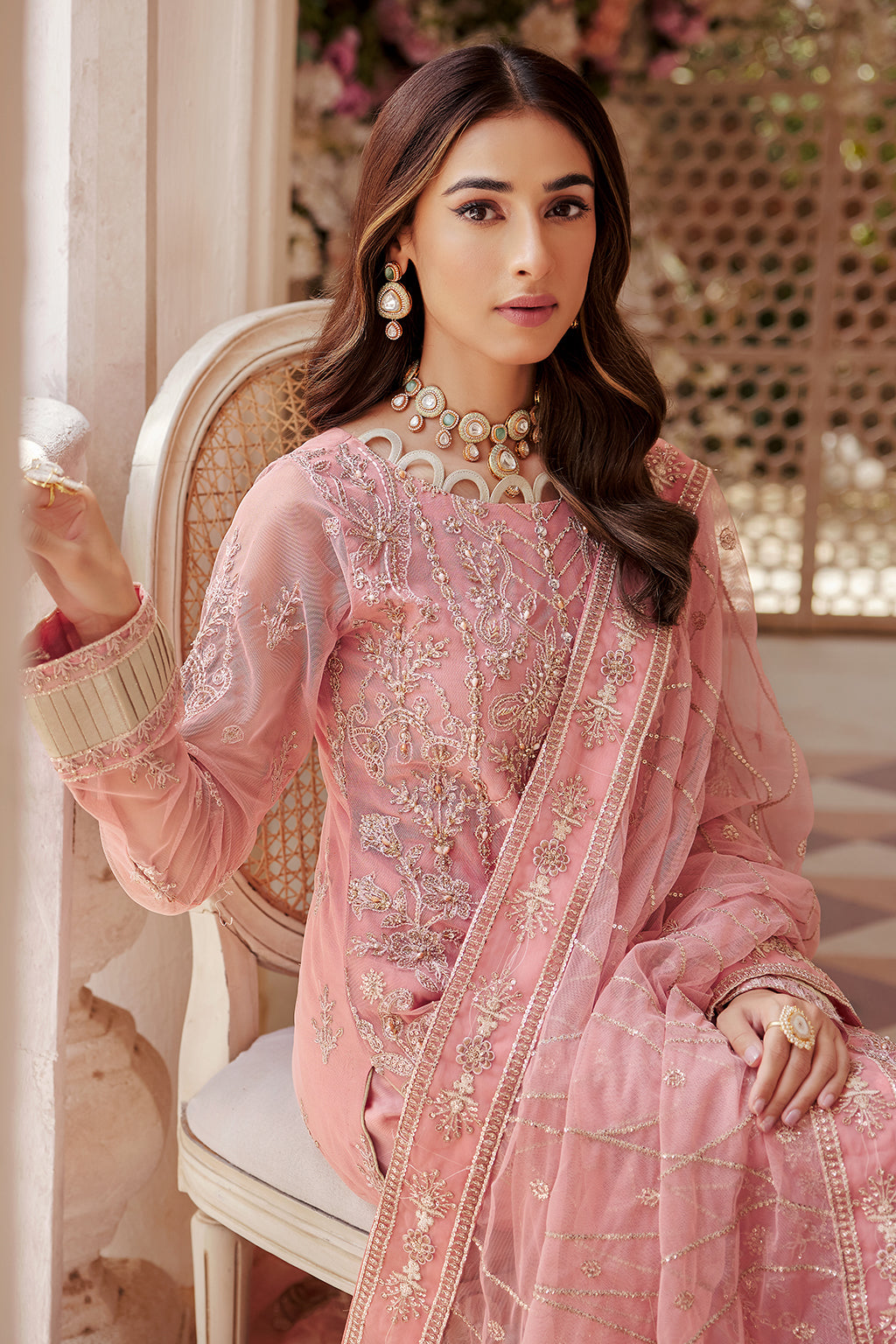 Net Embroidered Hand Made Front. Net Embroidered Back. Net Embroidered Sleeves. Organza Embroidered Front and Back Border. Organza Embroidered Front,Back and Sleeves lace. Net Embroidered dupatta. Organza Embroidered dupatta Border. Organza Embroidered dupatta palu. Raw Silk trouser.