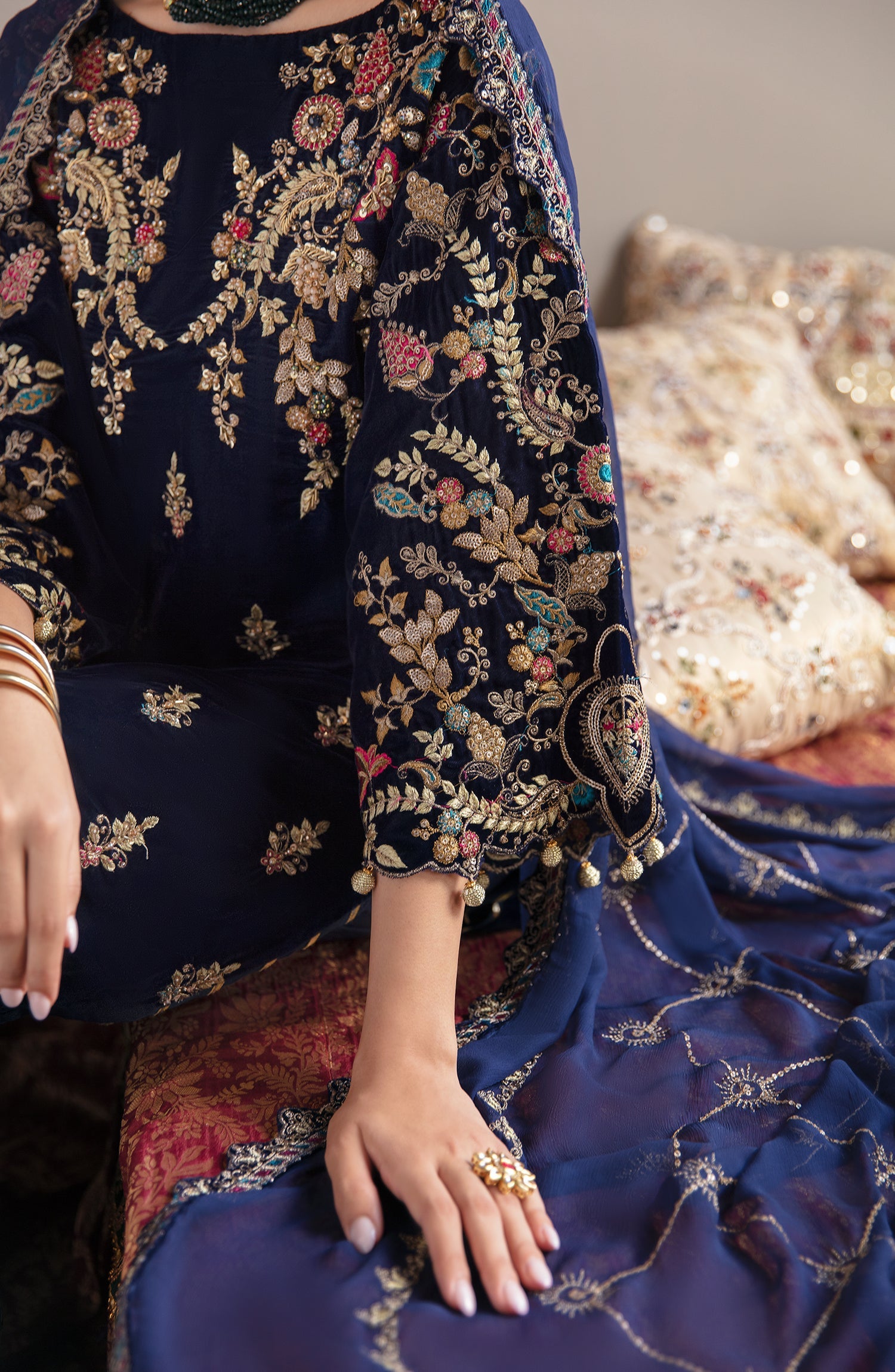 Velvet Embroidered Hand Made Front. Velvet Embroidered Sleeves. Velvet Fabric for Back. Velvet Embroidered Front and Back Border. Chiffon Embroidered Dupatta. Organza Embroidered Dupatta Lace. Dyed Raw Silk trouser.