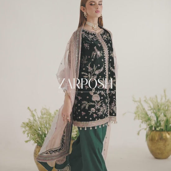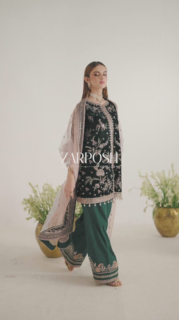 Velvet Fabric for Front Right and Left Panel. Velvet Embroidered Sleeves. Velvet Fabric for Back. Organza Embroidered Dupatta. Grip Embroidered Front,Back and Sleeves Laces. Grip Embroidered Sleeves Lace. Grip Embroidered Dupatta Lace. Grip Embroidered Trouser Patch. Raw Silk Trouser.