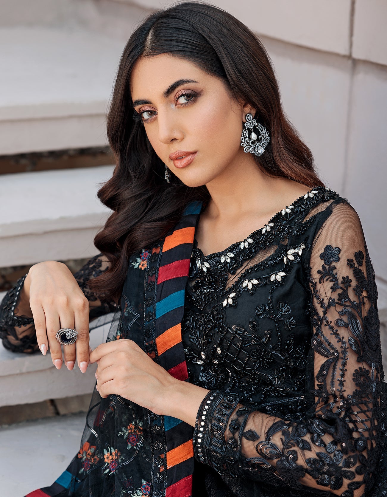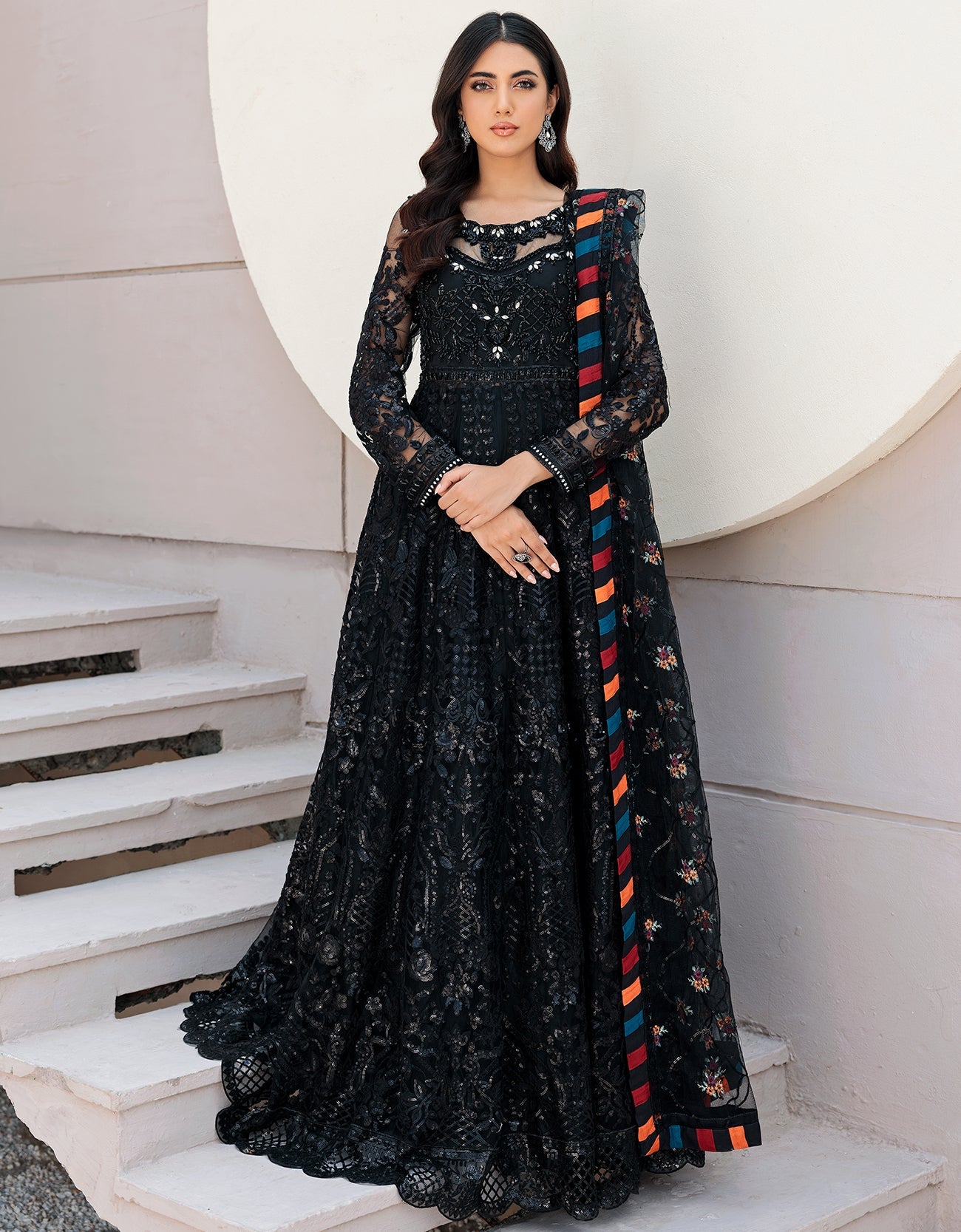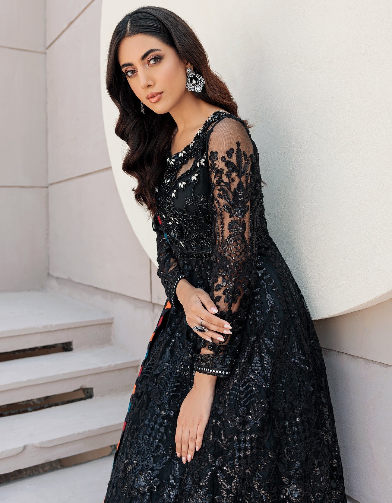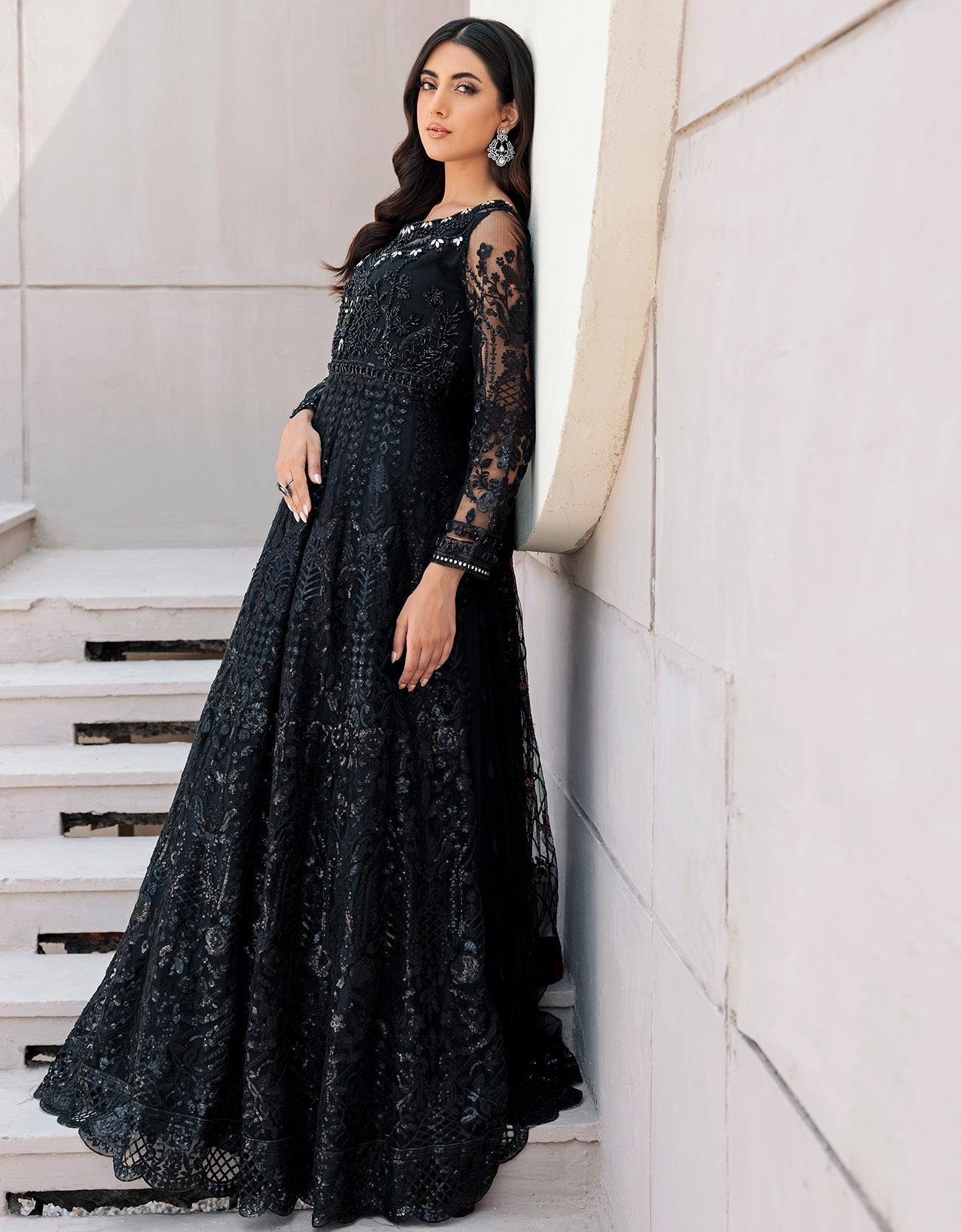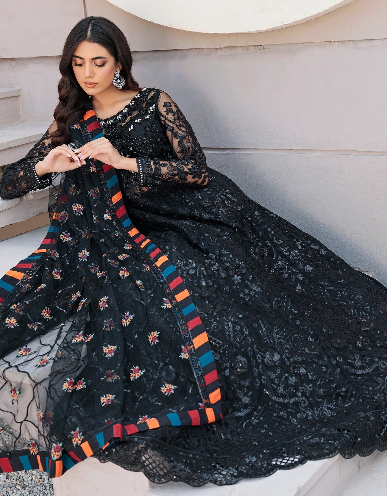 NET EMBROIDERED HAND MADE FRONT BODY. NET EMBROIDERED BACK BODY. NET EMBROIDERED FRONT PANELS. NET EMBROIDERED BACK PANELS. NET EMBROIDERED SLEEVES. NET EMBROIDERED DUPATTA. ORGANZA EMBROIDERED FRONT AND BACK BORDER. ORGANZA EMBROIDERED SLEEVES BORDER. ORGANZA EMBROIDERED SLEEVES FOIL LACE. DYED RAW SILK TROUSER.