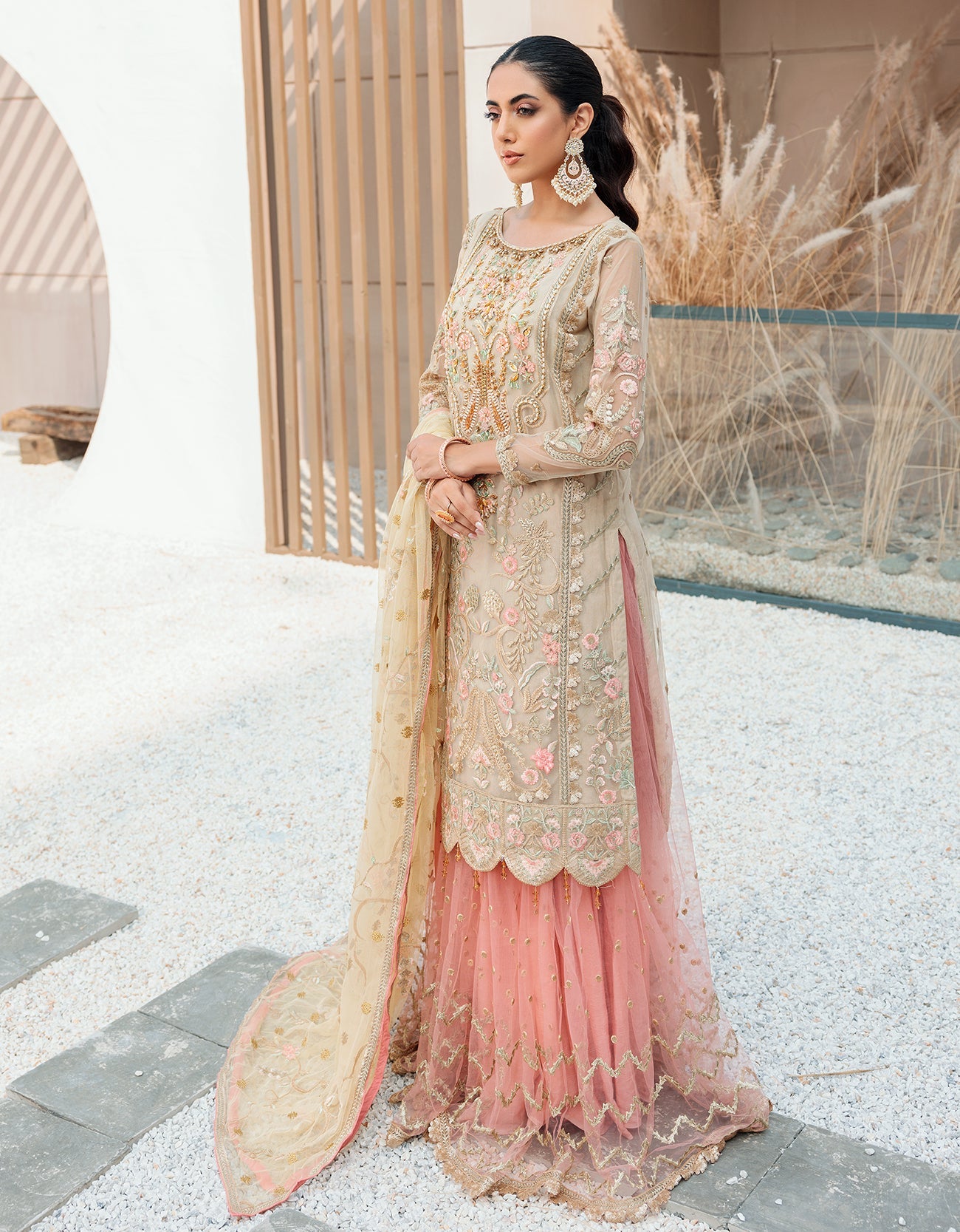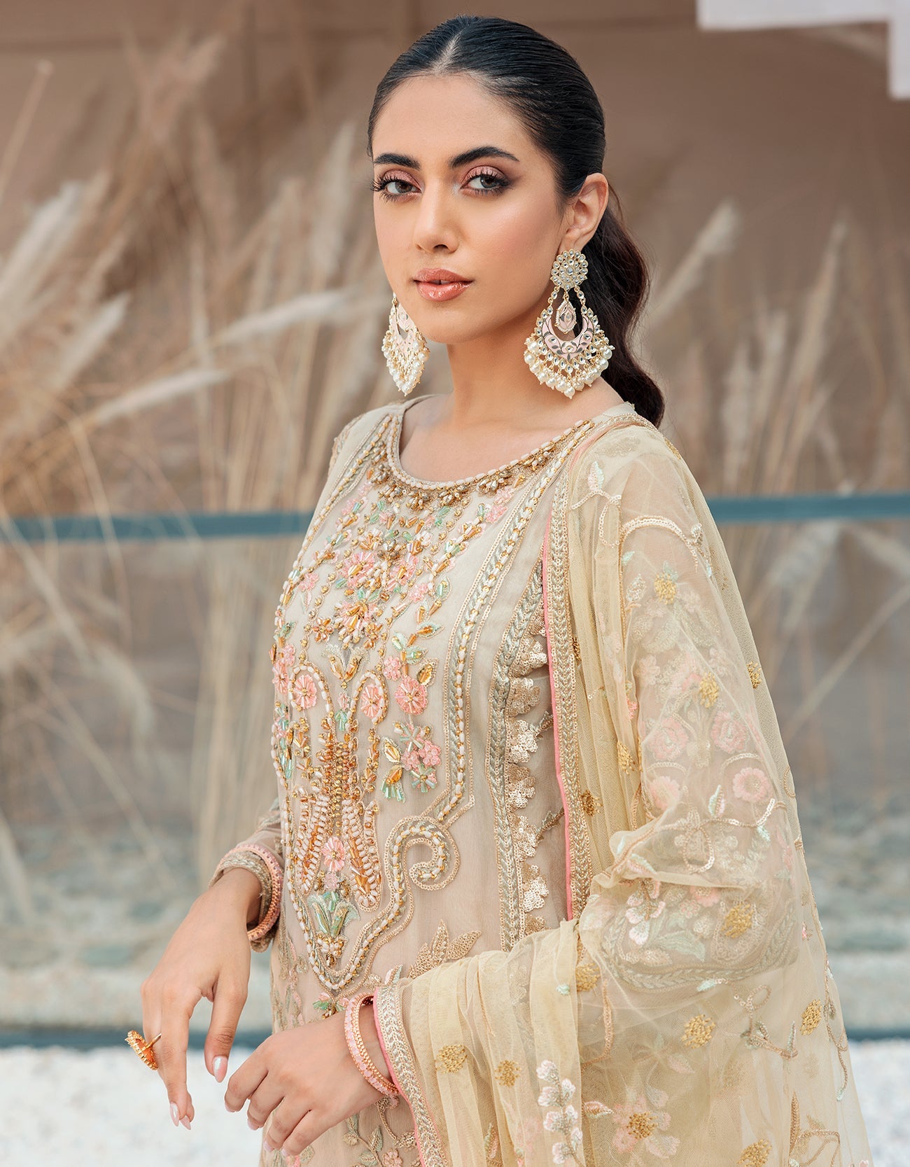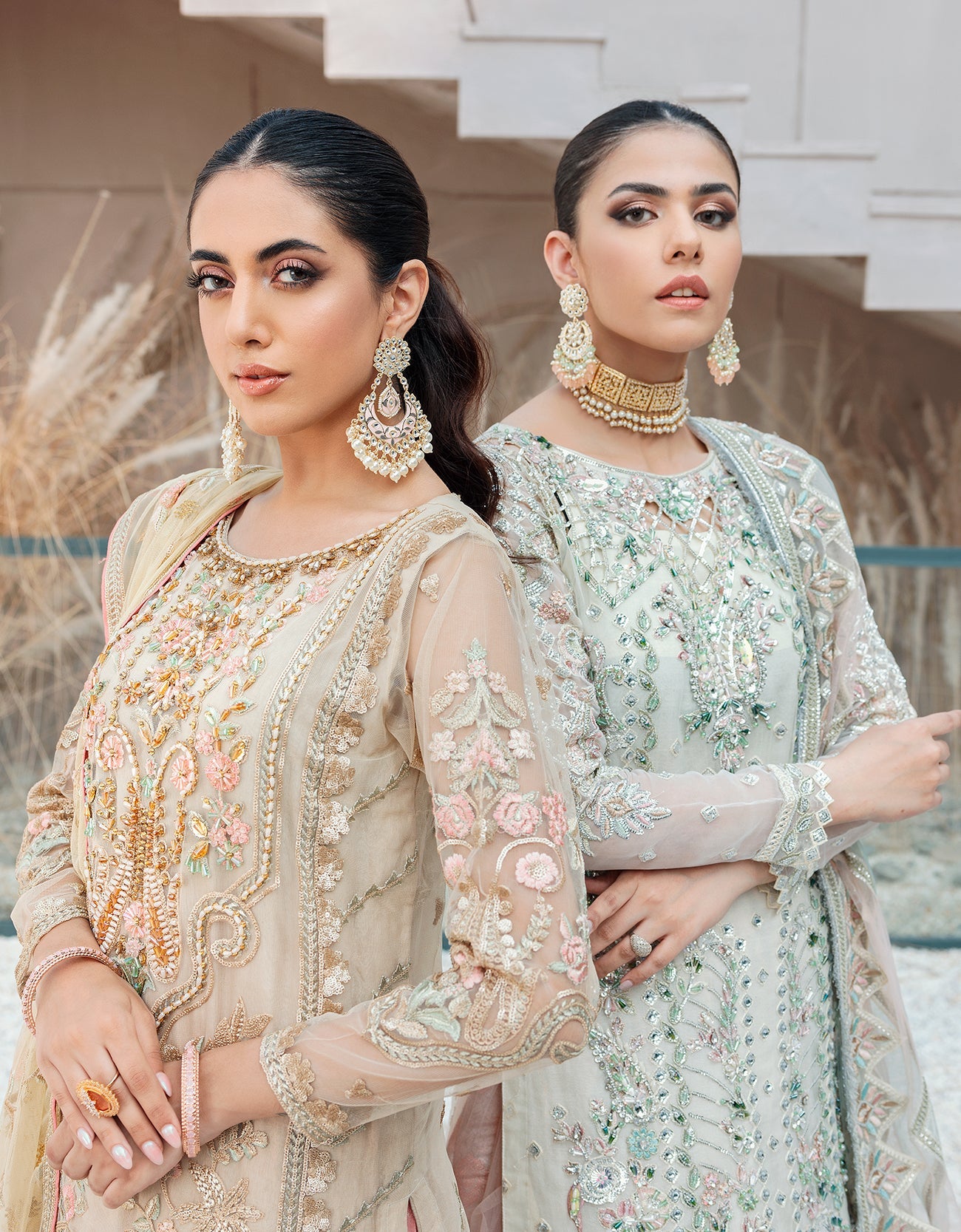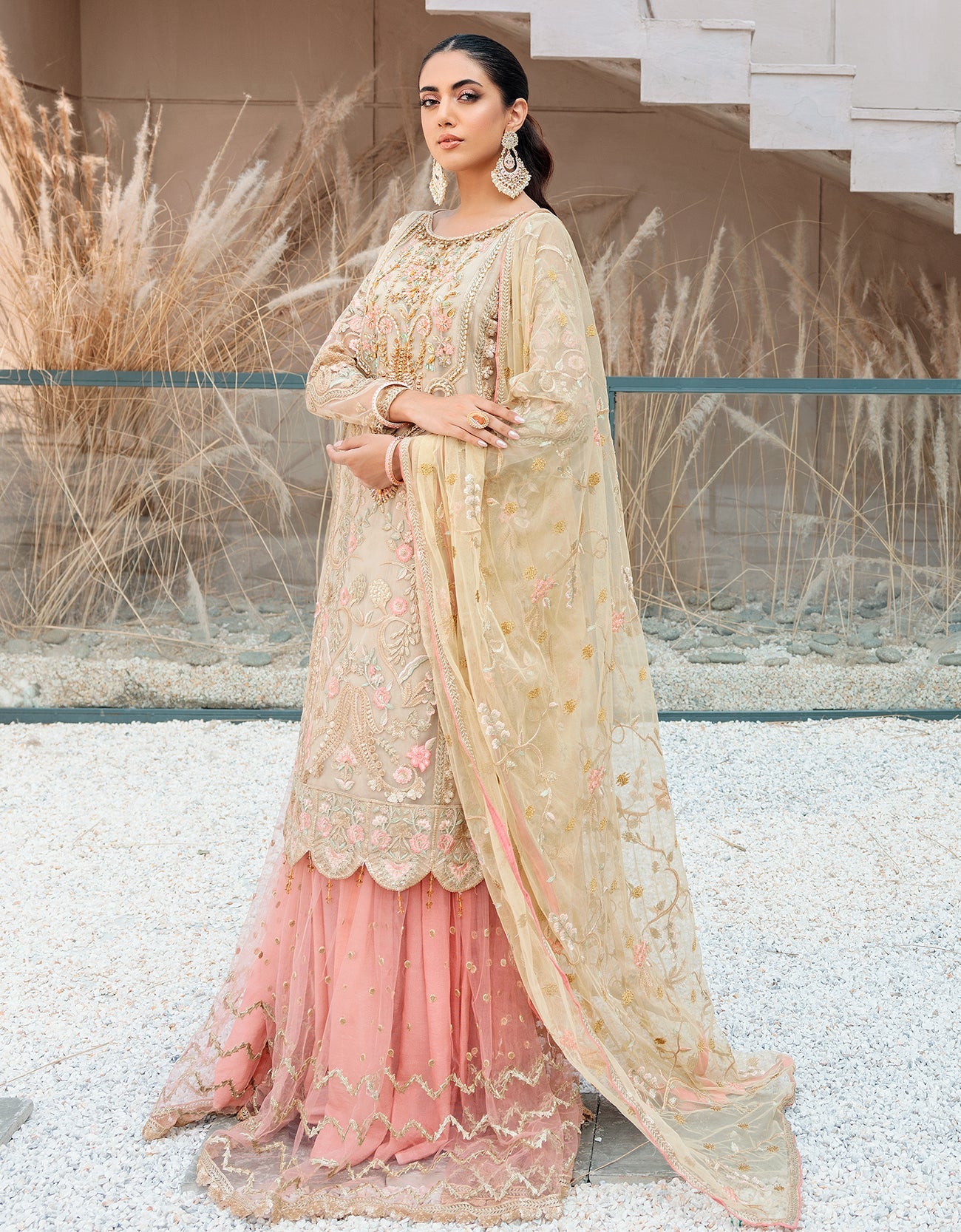 NET EMBROIDERED HAND MADE FRONT. NET EMBROIDERED BACK. NET EMBROIDERED SLEEVES. NET EMBROIDERED DUPATTA. NET EMBROIDERED SHARARA. ORGANZA EMBROIDERED FRONT AND BACK BORDER. DYED RAW SILK TROUSER