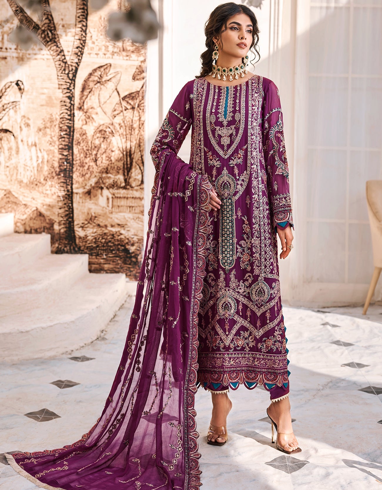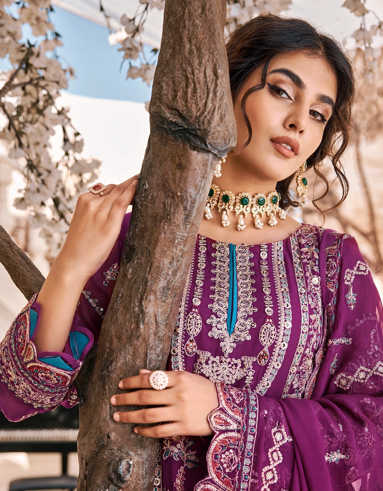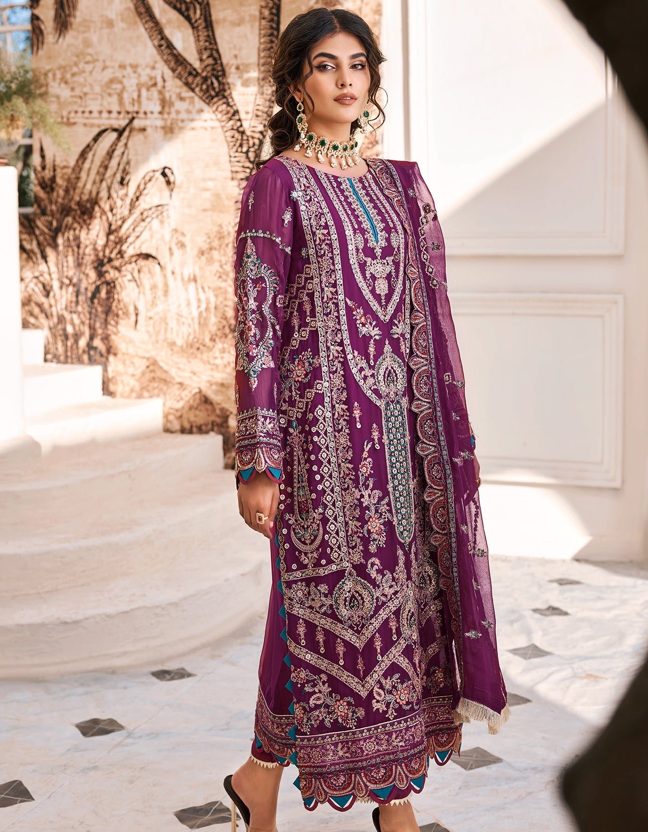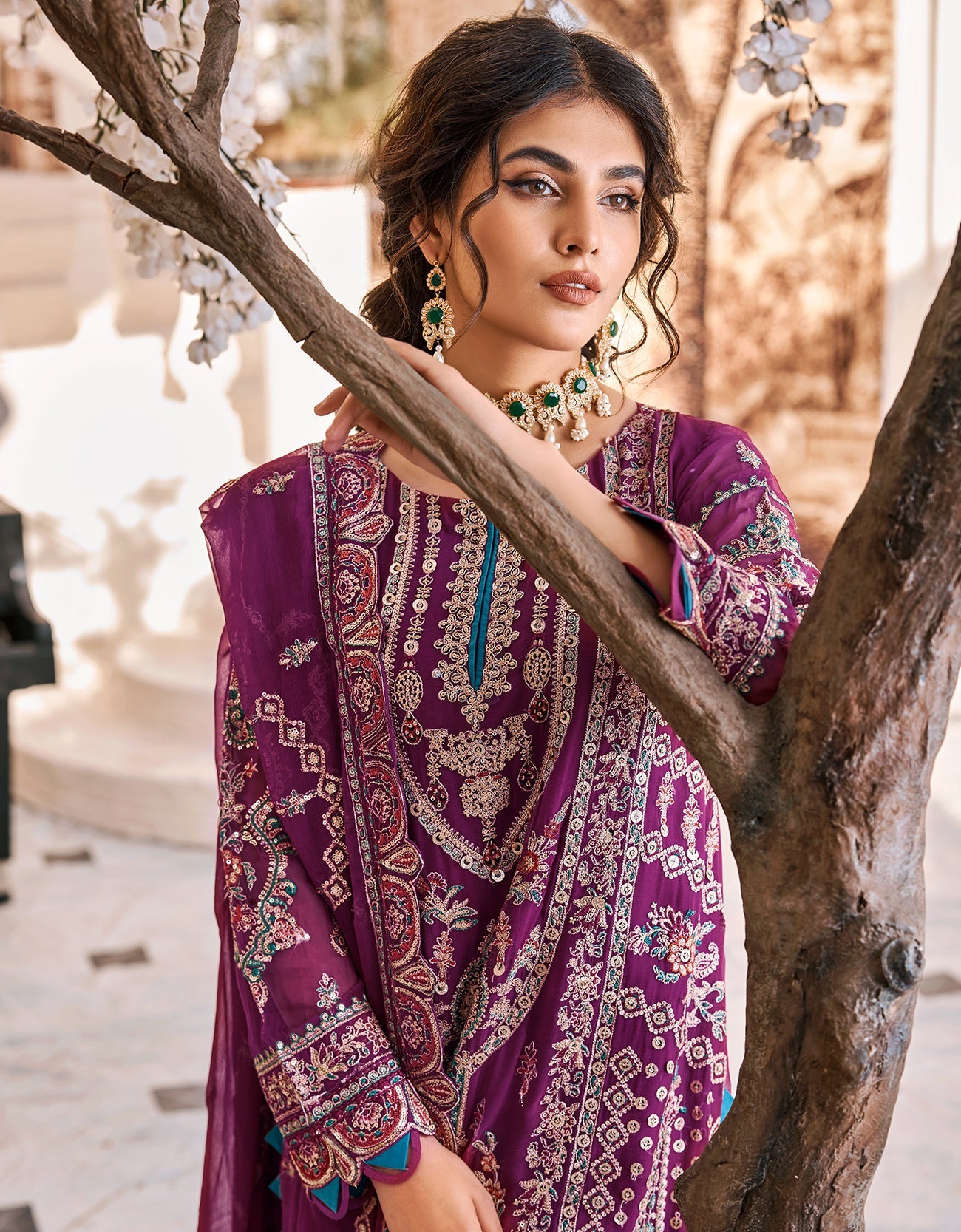 Chiffon Embroidered with Multi sequins center panel. Chiffon Embroidered Front Right and Left Panels. Chiffon Embroidered Sleeves. Chiffon Fabric for back. Organza Embroidered back motif. Organza Embroidered Front and back border. Organza Embroidered Sleeves border. Ready to wear Chiffon Embroidered Dupatta. Dyed Raw silk Trouser.